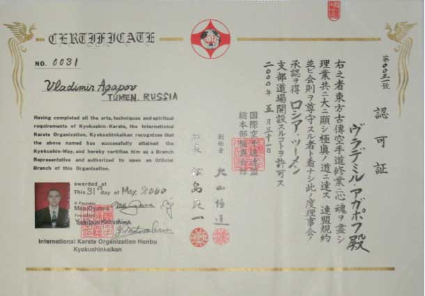 (Matsushima group)Владимир Агапов 4 Dan Бранч-контракт № 0031, выдан 31 мая 2000г. |