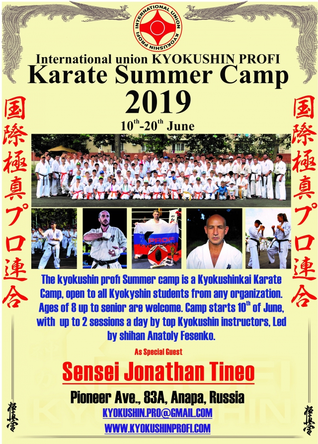 10-20 июня 2019 года испанский сэнсей Джонатан Тинео и сэнсей Сергей Плеханов станут главными инструкторами традиционных летних сборов Киокушин Профи, на берегу Черного моря в Анапе.Сборы открыты для всех последователей киокушина. Ежегодно в июне шихан Фесенко собирает в Анапе каратистов со всей России, чтобы в рамках учебно-тренировочных сборов повысить уровень действующих спортсменов и инструкторов.