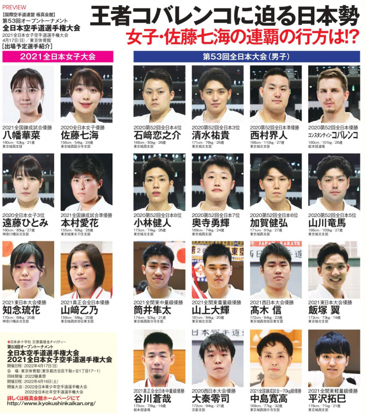17 апреля 2022 года в Токийском дворце спорта (Tokyo Metropolitan Gymnasium) пройдет 53-й абсолютный Чемпионат Японии киокушинкай / The 53rd All Japan Open Karate Championship среди мужчин и женщин.В турнире примет участие российский боец, действующий Чемпион Японии Константин Коваленко, он будет выступать за Со Хонбу.
