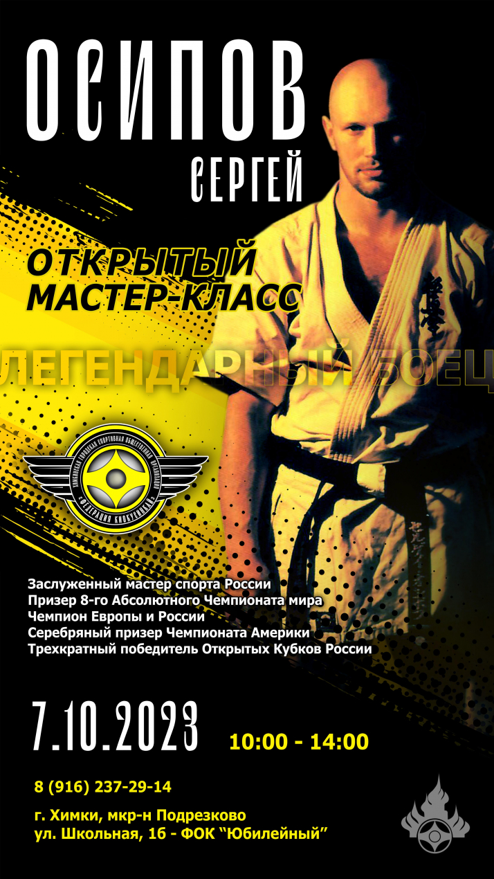 7 октября 2023 года в физкультурно-оздоровительном комплексе «Юбилейный» города Химки (Московская область) пройдет мастер-класс легендарного бойца Сергея Осипова - Заслуженного мастера спорта России, призера 8-го абсолютного чемпионата мира, чемпиона Европы и России.Сергей Осипов уникальный спортсмен и гениальный нокаутер - обладая умным телом, идеальным таймингом, мощным и поставленным ударом он вызывал приступы страха у своих соперников.