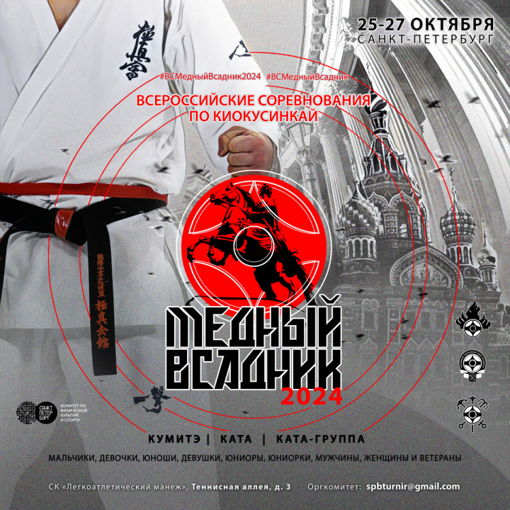 26-27 октября 2024 года в Санкт-Петербурге пройдут всероссийские соревнования по киокусинкай «Медный всадник» среди мальчиков, девочек, юношей, девушек, юниоров, юниорок, мужчин и женщин (весовые категории, ката, ката-группа).В связи с подготовкой и подачей в Министерство спорта РФ документов для введения новой возрастной категории ("молодежь"), соревнования в весовых категориях среди мужчин будут тестовыми и для участия будут допускаться спортсмены только от 18 лет до 21 года включительно (возраст определяется на 26 октября 2023 г.)! Все остальные категории - как обычно.