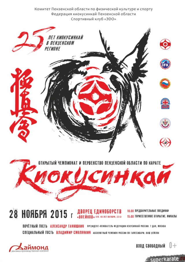 28 ноября 2015 года в городе Пенза в новом Дворце Единоборств «Воейков» состоится Открытый Чемпионат и Первенство Пензенской области по Киокусинкай (раздел кумитэ). В этом году на Чемпионат приедут спортсмены из Москвы, Нижнего Новгорода, Самары, Саратова, Брянска, Мордовии, Татарии, Чувашии и других регионов России, среди