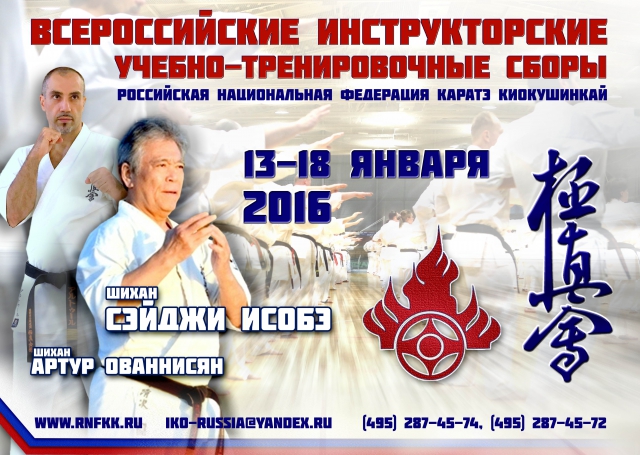С 13 по 18 января 2016 года на спортивной базе «Чехов» пройдут традиционные Всероссийские инструкторские сборы РНФКК. Сборы пройдут под руководством представителей IKO - шихана Сэйдзи Исобэ и шихана Артура Ованнисяна.