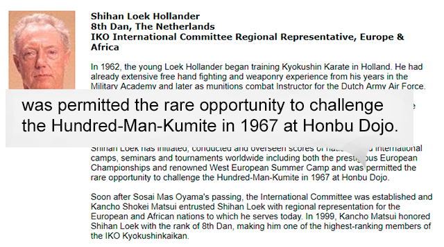 «Легендосочинитель» Люк Холландер (Loek Hollander) не прошел Хякунин кумитэ, вопреки существующей мемориальной доске. Он получил её от Оямы, благодаря чему сделал карьеру.