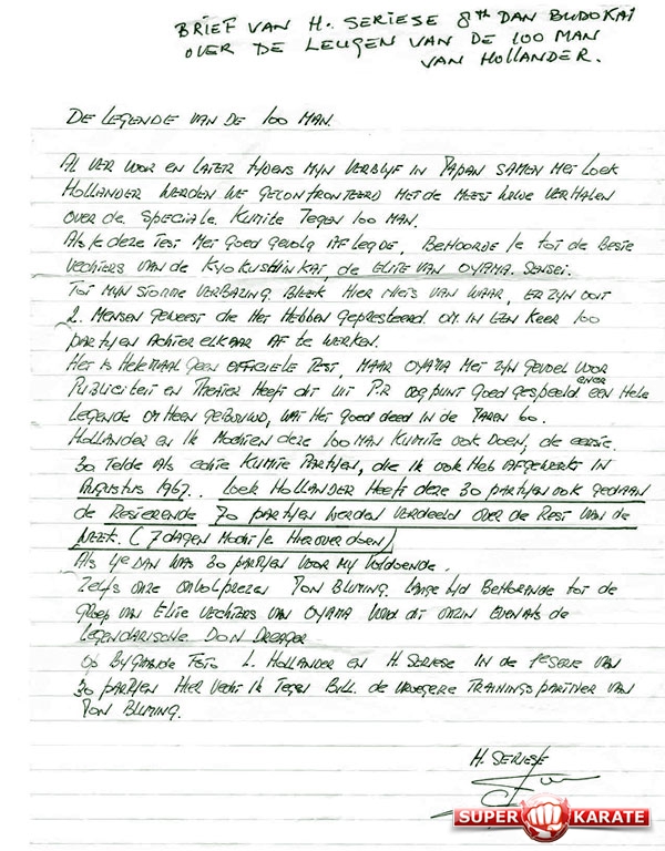Когда Люк Холландер собирался возвращаться в Голландию, он получил приказ от канте Оямы попытаться пройти 100 боев (Хякунин кумитэ).