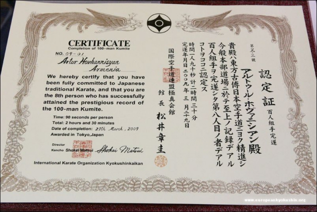 - Вторыми по весомости достижений можно поставить призеров абсолютного чемпионата мира и победителей чемпионата Японии одновременно. Таких из прошедших Хякунин кумитэ пятеро: Шокей Мацуи, Кейдзи Санпэй (2-я попытка), Акира Масуда, Кейдзи Ямаки и Хадзимэ Казуми. Все успешно закончили тест.- Дальше отметим тех у кого есть призовое место абсолютного чемпионата мира и призовое на чемпионате Японии. Таких у нас еще трое: Говард Коллинз, Адемир да Коста и Артур Ованнисян. Они прошли Хякунин кумитэ.