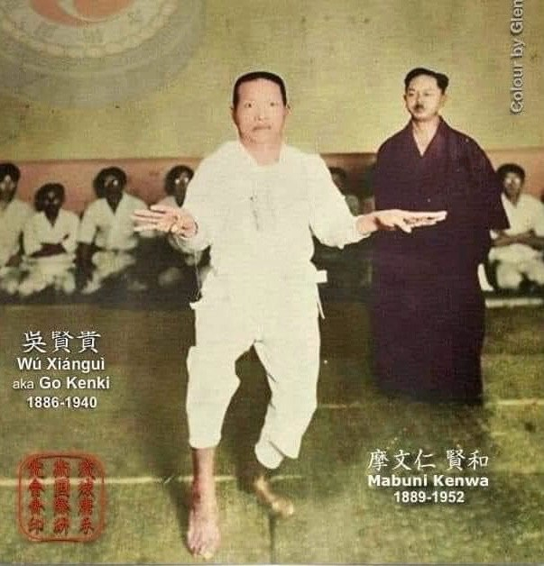 Теперь вернемся в 1900-е годы, когда зародилось современное каратэ. Го Кенки научил нескольких избранных окинавских детей китайскому белому журавлю в задней части своего чайного магазина. Чтобы они могли продолжить его учение. Он стал близким другом Канбуна Уэчи (1877–1948), который в 1925 году создал стиль Пангай Нун (полужесткий/полумягкий) Уэчи-рю. Позже Рю Ко Кабу (Тигровый журавль) Уэчи Рю. Теджин Мияги взял эти жесткие и мягкие техники при создании стиля каратэ Годзю-рю. Это распространилось на другие стили благодаря современным великим мастерам, таким как Симпо Матаеси (1922–1997), основатель Кингаи Рю Кобудо. И Хохан Сокен (1889–1982), основатель Мацумара Сието Серин Рю в 1976 году.