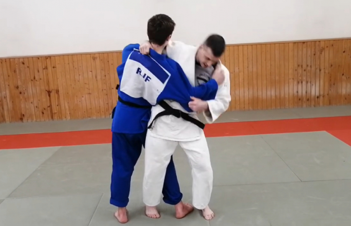 В том случае, если противник хватается за талию, защитнику рекомендуется правой рукой «отбросить» левую руку нападающего правым локтем, обхватить шею нападающего правой рукой и зафиксировать ее захватом. Правой рукой захватите левый локоть противника.