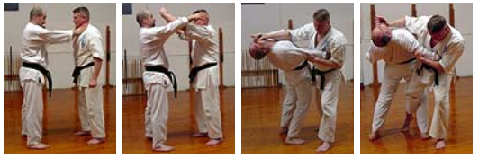 Этот пример представляет собой простую защиту дзюдзютсу от удушающего удара, при которой руки сжимаются или удерживаются вместе и направлены вверх к рукам нападающего, чтобы предотвратить атаку (пальцы также могут быть раскрыты и направлены также для атаки в глаза). Затем защищающийся обхватывает левой рукой и тянет правый локоть атакующего, одновременно используя правую ладонь для удара/толчка вверх и назад по подбородку атакующего. В то же время защитник делает шаг вперед под углом влево, что переносит вес нападающего на его правую ногу, в то время как действие толчка/тяги заставляет тело нападающего выгнуться назад. На последнем фото бросок выполнен.