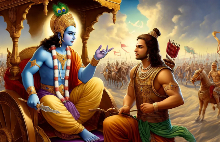 Гита начинается с того, что он просит Кришну вывести колесницу между двумя армиями. Арджуна видит, что его сородичи готовы умереть в бою, теряет решимость. Он выходит из своей колесницы и отказывается начать войну. Далее следует 18 коротких глав, в которых Кришна пытается убедить Арджуну, что он должен вести эту войну. Первоначально в качестве причин он приводит достойный характер воина, его честь, чувство долга и социальной ответственности. Но ни одно из них не имеет большого значения в момент сомнения Арджуны, и, конечно, они мало что значат для тех, кто живет за пределами индуистской кастовой системы.