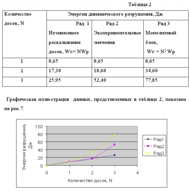 Эксперименты по раскалыванию одной и двух досок с размерами 285х215х22 мм (расстояние между опорами 260 мм) падающим грузам с массой 2 кг уже проводились авторами ранее /5/. Было установлено, что энергия разрушения двух досок лишь на незначительную величину превышает удвоенное значение энергии разрушения одной доски. В дополнение к этим экспериментам были поставлены опыты с использованием досок из этой же партии по ударному раскалыванию групп из трех досок. В таблице 2 представлены: экспериментальные значения энергии разрушения одной, групп из двух и трех досок, расчетные значения энергий при их независимом разрушении, а также энергия разрушения одиночного монолитного блока с толщиной, равной суммарной толщине досок в группе.