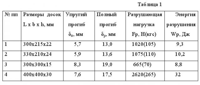(нагрузка – в Ньютонах, прогиб – в метрах, энергия – в Джоулях).В приведенной ниже таблице 1 в качестве справочного материала представлены характеристики разрушения досок различного размера,