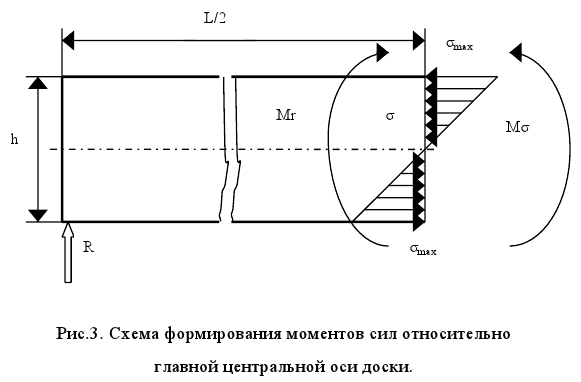 Момент от силы R уравновешивается моментом Мσ, создаваемым внутренними силами растяжения-сжатия в поперечном сечении доски (рис.3).