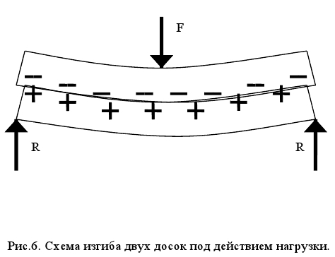 Небезинтересно отметить, что зависимость прилагаемой силы от толщины доски носит квадратичный характер. Это означает, например, что при возрастании толщины доски в два раза силу F надо увеличить в четыре раза, чтобы обеспечить одинаковое значение максимального напряжения растяжения-сжатия. Снижение толщины доски в два раза уменьшает требуемую силу в четыре раза в полном соответствии с народной мудростью – «где тонко, там и рвется».Как видно из формулы (3), максимальное напряжение возрастает пропорционально величине прикладываемой силы. Когда значение максимального напряжения σмах достигнет предела прочности древесины σп, начнется процесс разрушения доски. Предел прочности древесины на растяжение, как правило, выше, чем предел прочности на сжатие (в отличие от металлов и сплавов), поэтому первая стадия разрушения (смятие волокон) начнется в середине верхней части доски. Это приведет к общему ослаблению прочности доски в поперечном сечении с последующим появлением трещины уже в нижней части доски и дальнейшим ее окончательным растрескиванием.