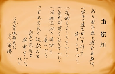 Тогда в Доджо Оямы практиковалась клятва воспитанника «Годзёкун», которая впоследствии легла в основу «Додзекун». Каждому новичку эта клятва вручалась, напечатанной на грубой бумаге.