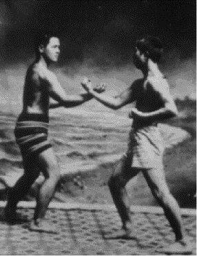 Все это не секрет и описано в различной литературе. Насчет упрощения – это мое личное мнение (правда не только мое), основанное на различных знакомствах с мастерами у-шу. На вопрос о том, где же тогда мастера тайдзи, багуа и т.д. на соревнованиях по миксфайту, могу ответить, что цель этих занятий в другом – это раз. А два – китайцы придумали свою эффективную формулу боя САНЬДА, а там уж поверьте, можно встретить выходцев из самых разных видов у-шу. Вот эти фото хорошо иллюстрируют китайские корни карате. На первой из них К. Мабуни наблюдает за исполнением ката (тао) из фудзьяньского стиля журавля.