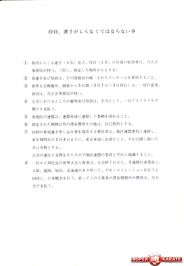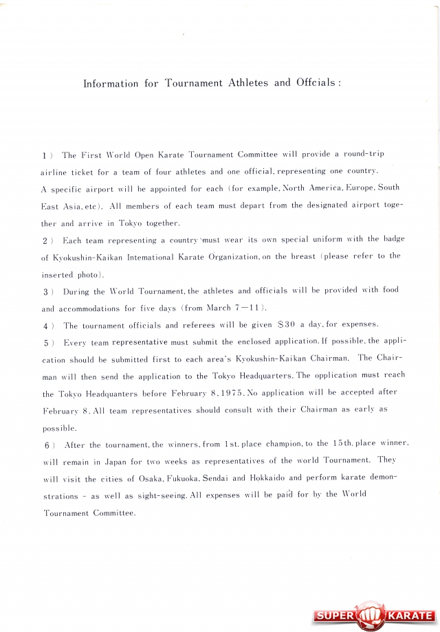 7) Заявку на участие в Чемпионате (приложение) необходимо подать в Головной офис в Токио только после предварительного информирования местного отделения Союза киокусин и в срок до 8.02.1975. Заявки, поданные позднее, не принимаются к рассмотрению. По всем вопросам необходимо сперва обращаться в местные отделения Международной организации Киокусинкай.