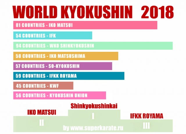 Со-Киокушин и Союз Киокушин набрали 57 и 56 стран соответственно.