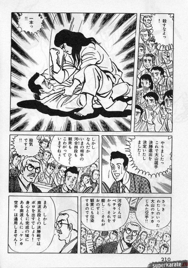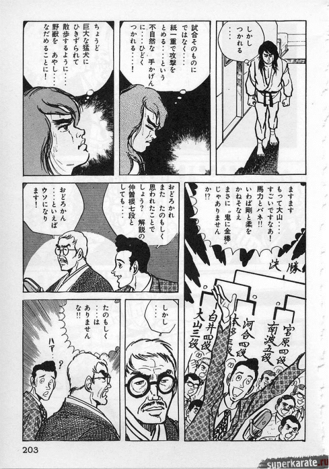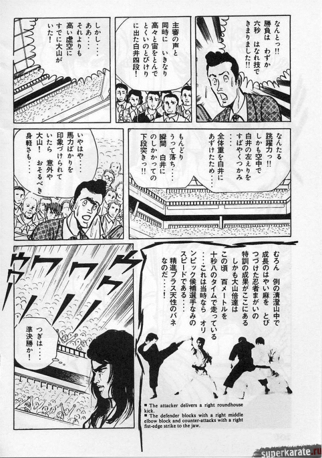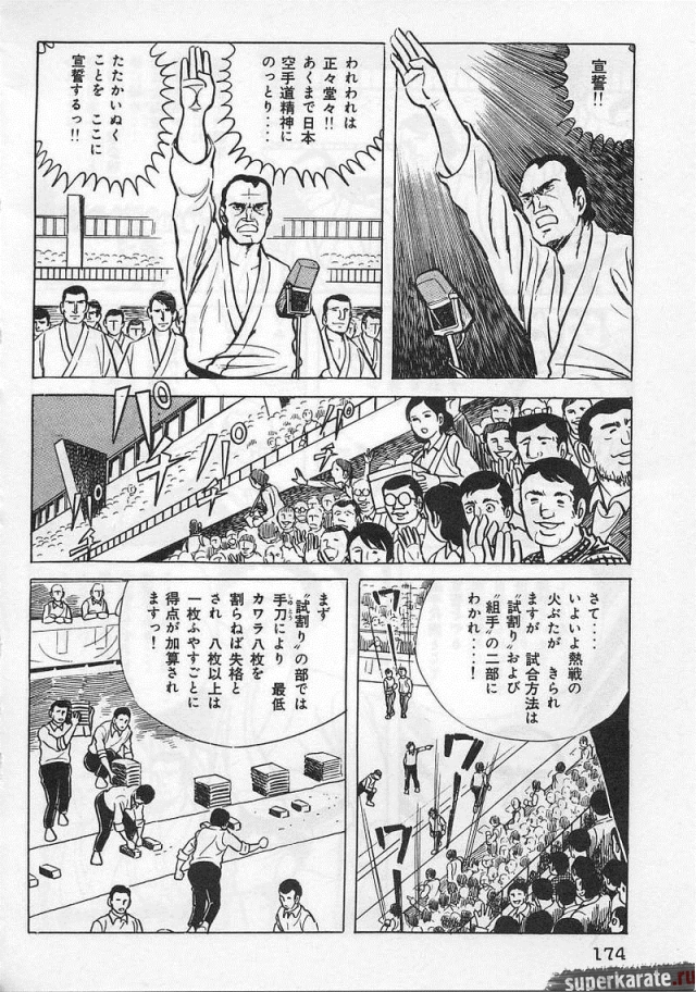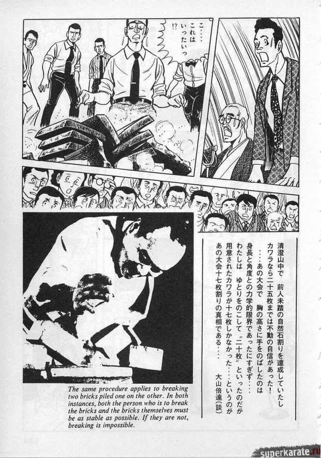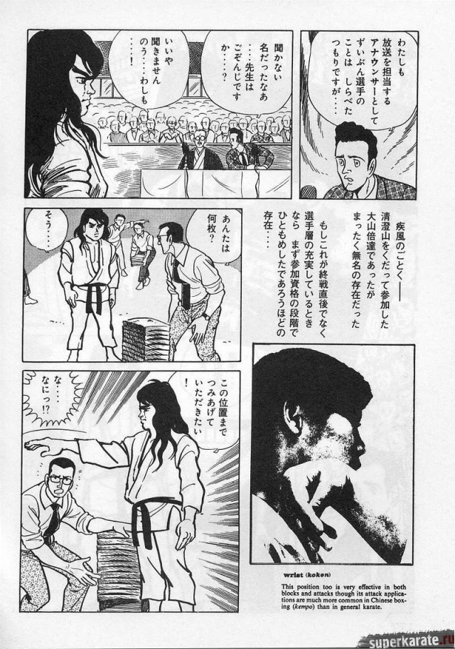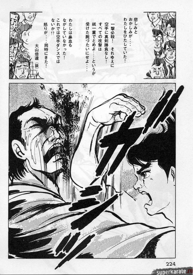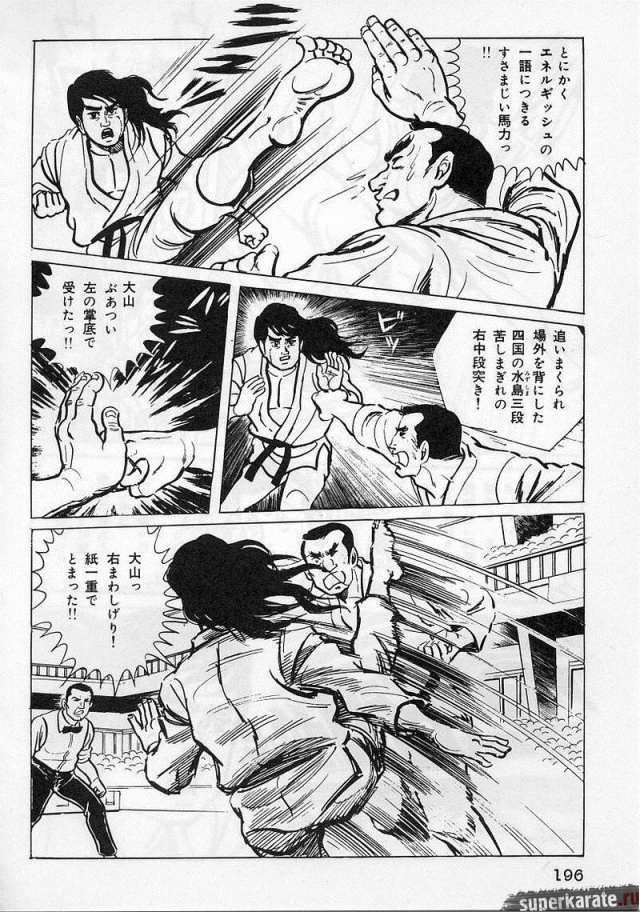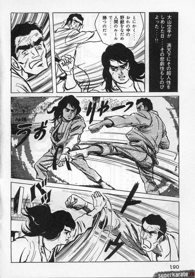 «Хоть это и были послевоенные годы, посмотреть турнир собралось около тысячи человек. Все были удивлены внезапным появлением учителя Оямы. Это можно увидеть и в фильмах, и гэкига (в 1960-х годах так называли японские комиксы (манга), отличавшиеся качеством и реалистичностью рисовки по сравнению с детской мангой, кроме того, гэкига имела более сложный и запутанный сюжет — прим. переводчика) о нем. Это было так же потрясающе, как в фильмах и гэкига. С места поединков было слышно учащенное дыхание. Наверное, вы уже слышали это непосредственно от учителя Оямы, но его внешний вид был устрашающим. Что ни говори, а его сверкающие глаза были потрясающи, а ярость, казалось, пылала вокруг всей его сущности. В то время я не разбирался в каратэ, но было видно, что другие спортсмены учителю и в подметки не годились. Казалось, никто не подступится к нему с его скоростью и силой... Почти все участники турнира быстро проигрывали. Они совершенно не годились Ояме в противники. На счет 1 готовились, на счет 2 принималась атака противника и на счет 3 производилось нападение на противника. В таком духе проходил каждый поединок. С физической стороны в то время учитель был крупным, однако такими же были и большинство спортсменов. Поэтому дело было не в физической силе. Даже такому непрофессионалу как мне была четко видна разница в их силе и мастерстве».