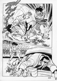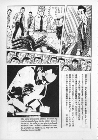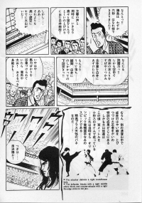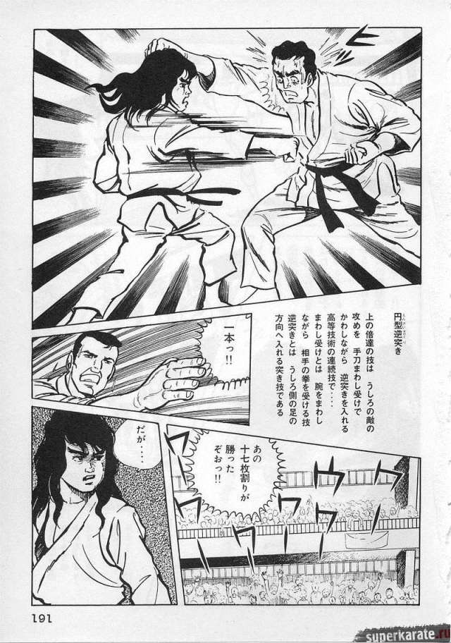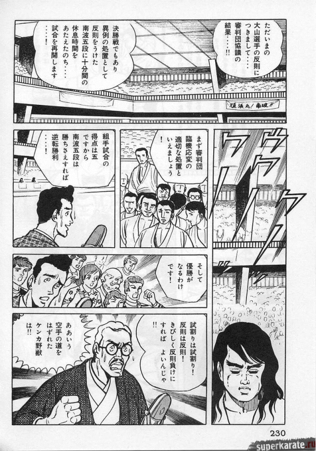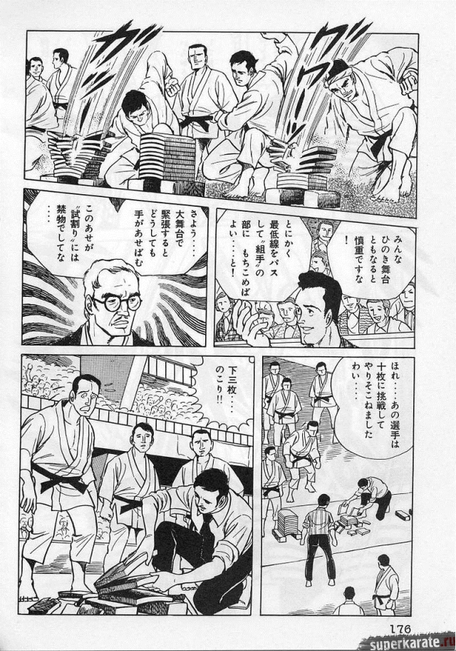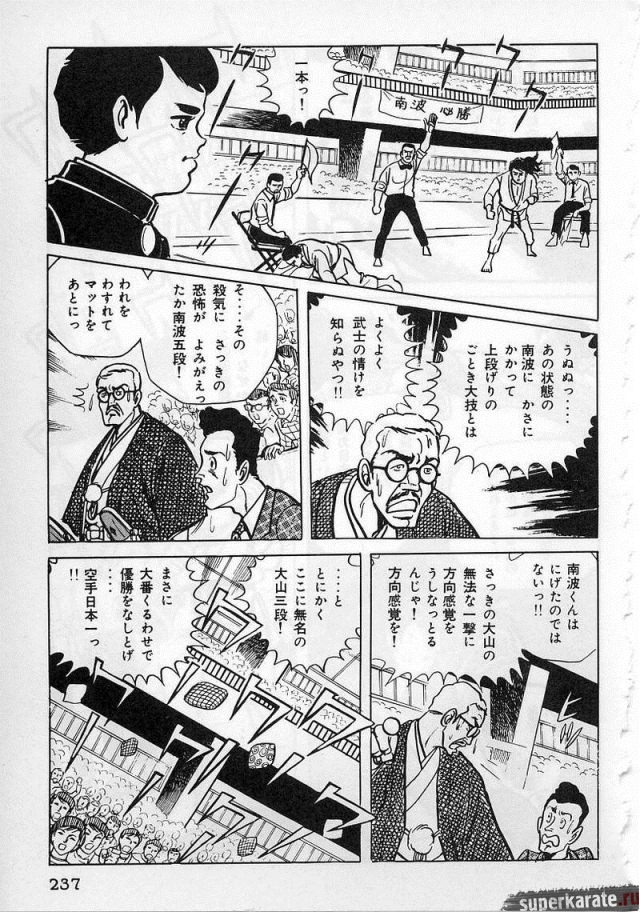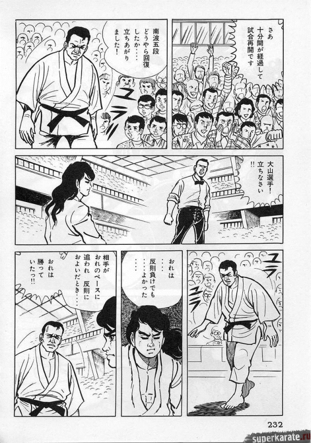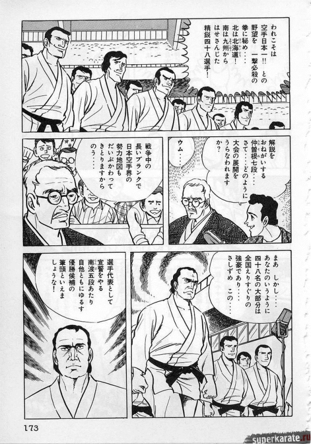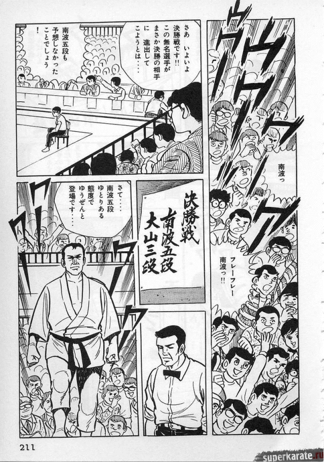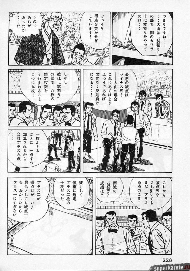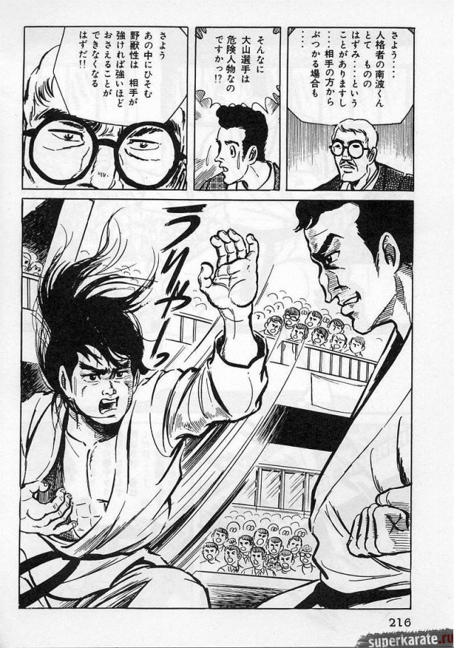 «Хоть это и были послевоенные годы, посмотреть турнир собралось около тысячи человек. Все были удивлены внезапным появлением учителя Оямы. Это можно увидеть и в фильмах, и гэкига (в 1960-х годах так называли японские комиксы (манга), отличавшиеся качеством и реалистичностью рисовки по сравнению с детской мангой, кроме того, гэкига имела более сложный и запутанный сюжет — прим. переводчика) о нем. Это было так же потрясающе, как в фильмах и гэкига. С места поединков было слышно учащенное дыхание. Наверное, вы уже слышали это непосредственно от учителя Оямы, но его внешний вид был устрашающим. Что ни говори, а его сверкающие глаза были потрясающи, а ярость, казалось, пылала вокруг всей его сущности. В то время я не разбирался в каратэ, но было видно, что другие спортсмены учителю и в подметки не годились. Казалось, никто не подступится к нему с его скоростью и силой... Почти все участники турнира быстро проигрывали. Они совершенно не годились Ояме в противники. На счет 1 готовились, на счет 2 принималась атака противника и на счет 3 производилось нападение на противника. В таком духе проходил каждый поединок. С физической стороны в то время учитель был крупным, однако такими же были и большинство спортсменов. Поэтому дело было не в физической силе. Даже такому непрофессионалу как мне была четко видна разница в их силе и мастерстве».