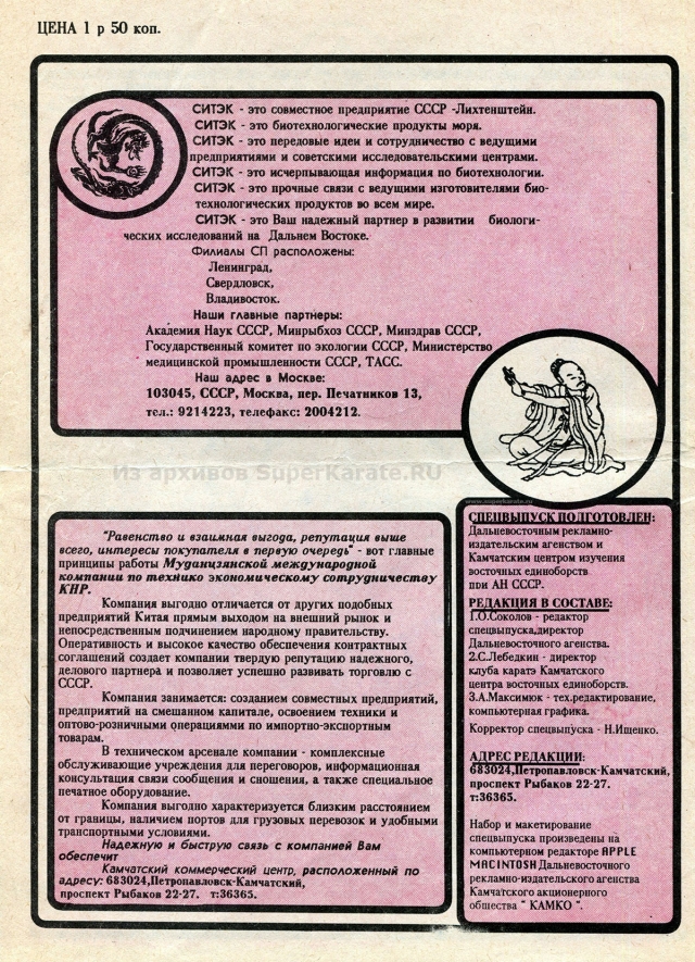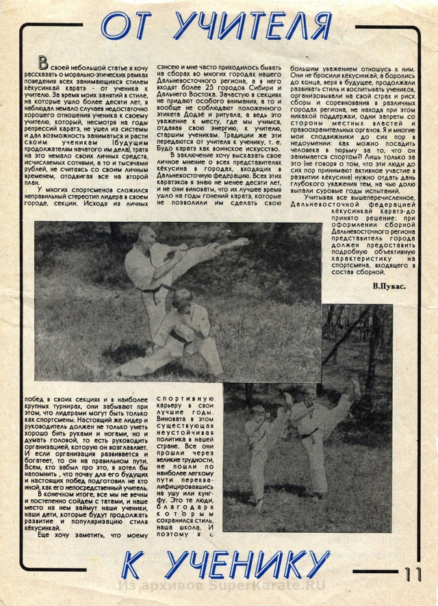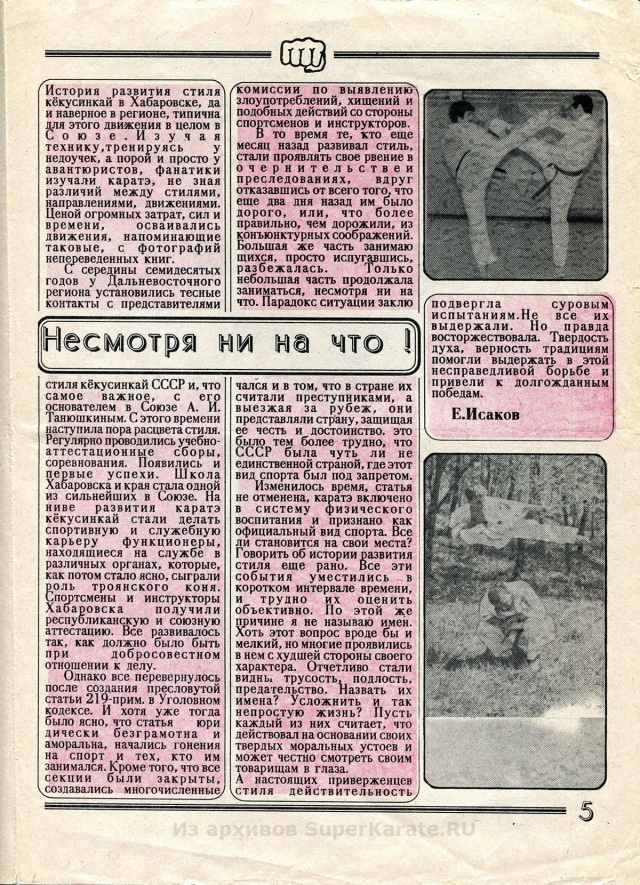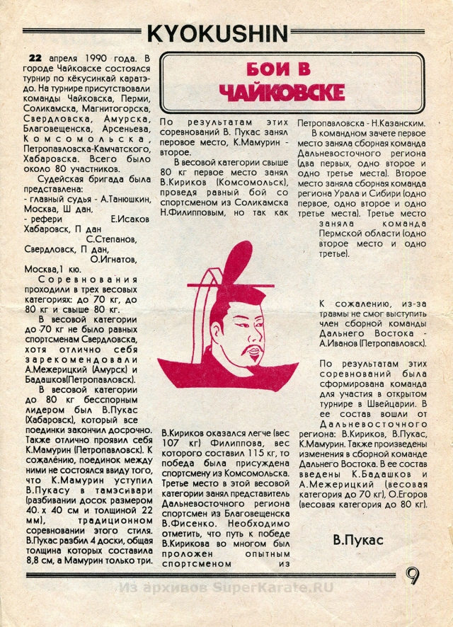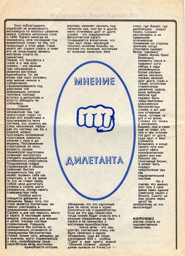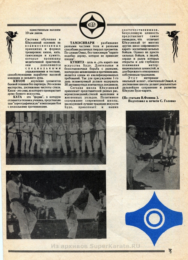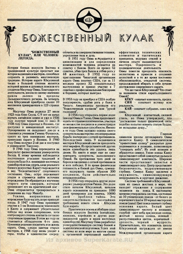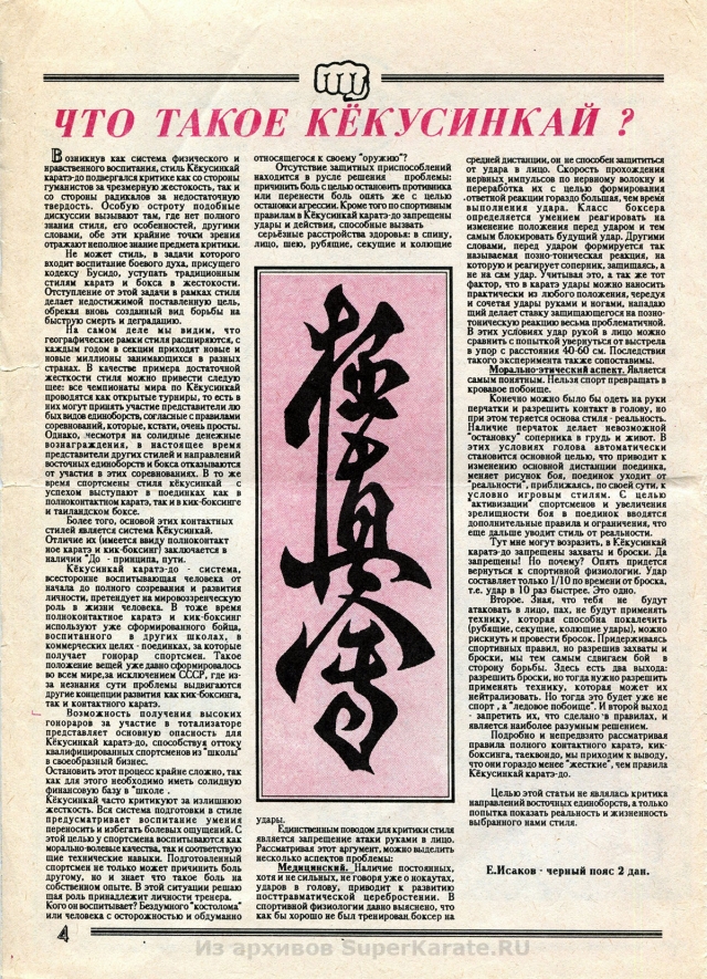 Этому 16-страничному изданию почти 25 лет. Первые статьи шиханов Валерия Пукаса, Евгения Исакова и других каратистов сейчас могут показаться малоактуальными и в чем-то даже наивными, но в свое время каждое их слово было способно придать сил, заставить оторваться с дивана и пойти в зал.