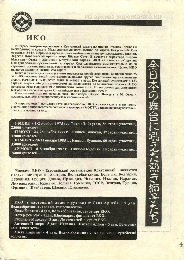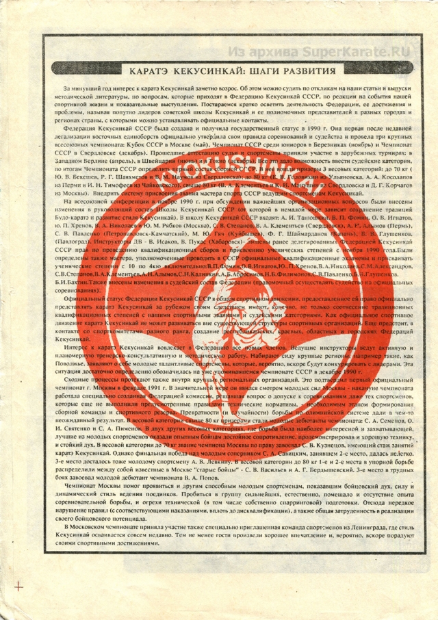 В 1991 году, по заказу Камчатской федерации Кекусинкай, вышел второй по счету информационный выпуск Каратэ Киокушин СССР (Kyokushin USSR). Этот выпуск оказался первым печатным информационным изданием, в котором было опубликовано информационное письмо по итогам Второй Всесоюзной конференции (проходила в Москве 25 ноября 1990 года), с этой конференции и начался фактический раскол Союзной организации киокушина.