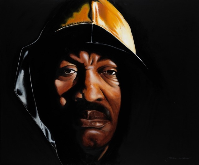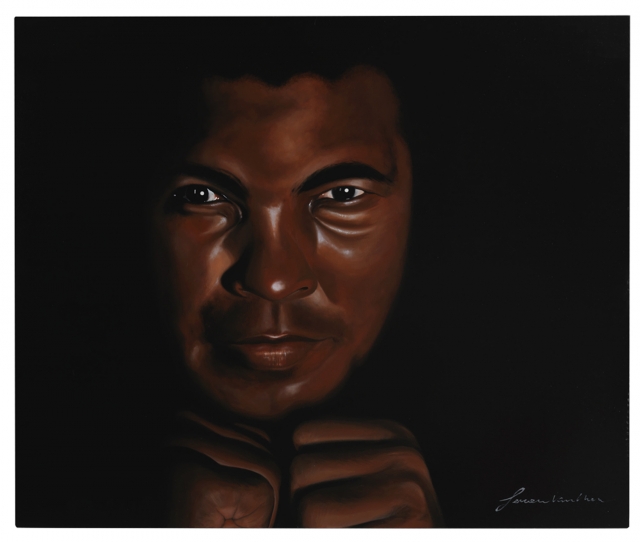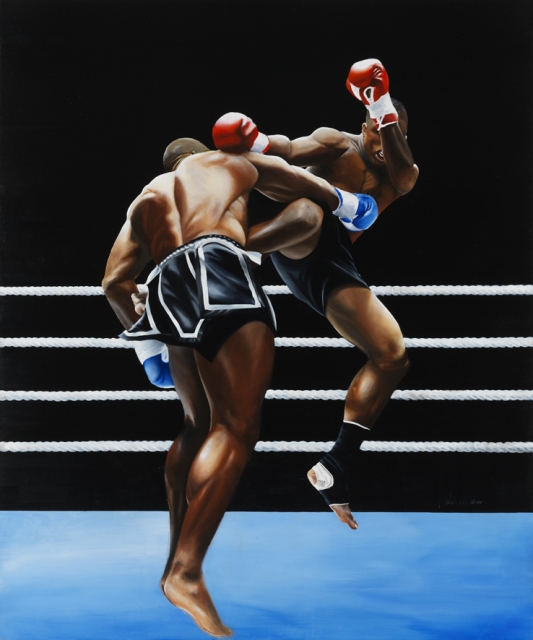 Некоторые картины действительно написаны с фото, например, бой Мелвина Манхуфа и Реми Боньяски. Это было на Амстердам Арене, на турнире It’s Showtime, тогда было сделано много фотографий. Мне понравилась одна из них, я стер задний фон, и сконцентрировался на бойцах, без публики и всего остального. Когда в Базеле я встретил Мелвина, я показал ему фотографию своей картины, которая была у меня в телефоне. Он сказал: «Я знаю это фото». Тогда я сказал, что это не фотография, это картина, которую я нарисовал. Он очень удивился и обрадовался, долго рассматривал. Иногда я собираю образ с нескольких фотографий, так например, получилась последняя картина Али. Было несколько фотографий с интервью, и я собрал их в один образ.
