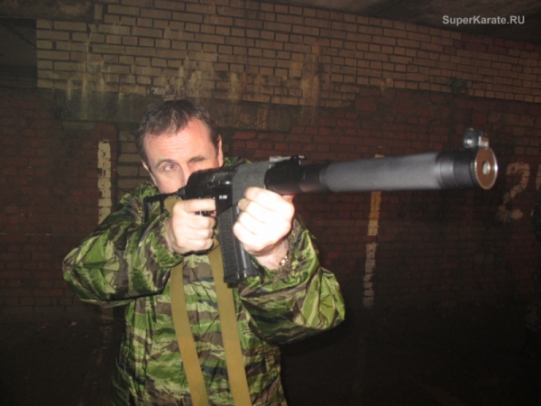 Шиханы стояли в разных стойках, держали оружие каждый своим хватом, но выглядели с оружием весьма органично. Александр Аркадьевич с какой-то азартно-ехидной улыбкой (аля, знай наших) засаживал в мишень одиночными и короткими очередями из какого-то автомата. Валентин Гедз сосредоточенный, но не напряженный пулял из бесшумной снайперки. А Сергей Герасимов, не зря носит на плече клеймо ВДВ, уверенно расстреливал подвал из пистолета "Ярыгина".