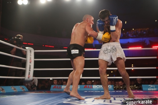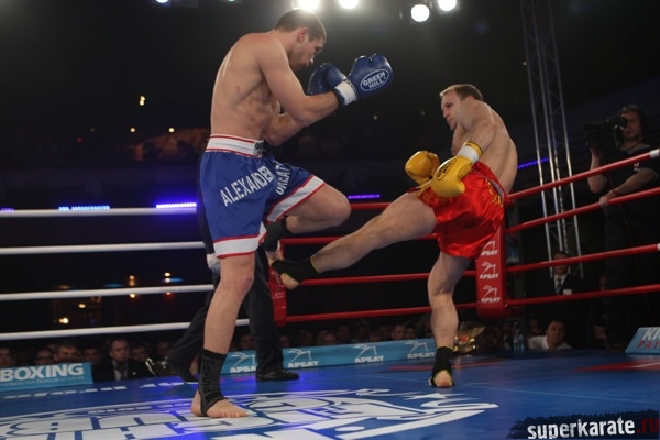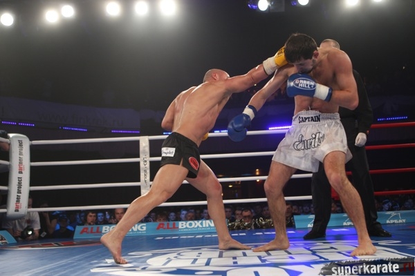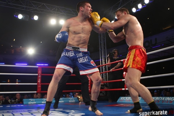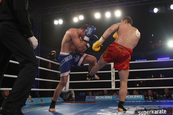 На ринг поднялись участники третьего супербоя. В весовой категории до 81 кг Александру Стецуренко (Россия) противостоял Василий Терешонок (Украина). С самого начала Терешонок активно начал контратаковать, разваливая все попытки Стецуренко зацепиться хотя бы одним ударом. Но не смотря на то, что в этот вечер у него многое не получалось, в том числе шла постоянная потеря стойки, Александр Стецуренко упорно шел вперед, пытаясь наладить свою атаку. Где-то в середине второго раунда ситуация для Стецуренко стала выправляться. Василий Терешонок к этому времени, потеряв много сил, с активных контратак стал работать спойлером – сам ничего толком не делал и другому не давал. Такая ситуация продолжалась до почти до конца третьего раунда, когда вдруг стало ясно, что Тершонок уже почти выдохся, а Стецуренко наконец вошел в свое рабочее состояние. И для спортсмена из Украины прозвенел первый звоночек. Второй прозвенел, когда судьи добавили экстрараунд, в котором Стецуренко в пух и прах разнес своего соперника, гоняя его по всему рингу. В конце раунда Трешонок побывал в хорошем стоячем нокдауне. И только финальный гонг помог ему достоять до конца на ногах. В итоге победа Александра Стецуреноко единогласным решением судей в экстрараунде.