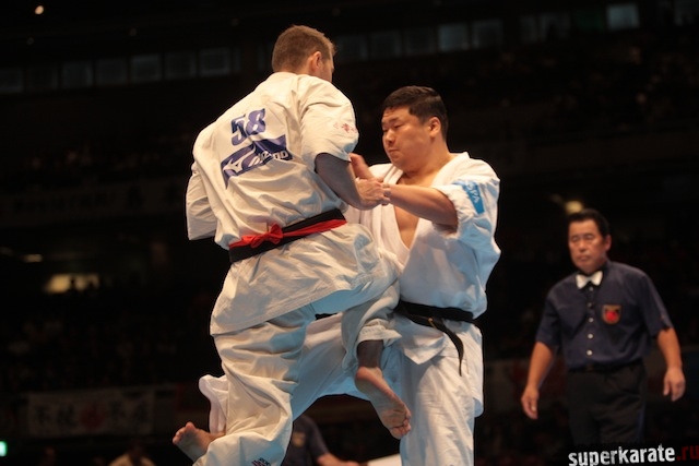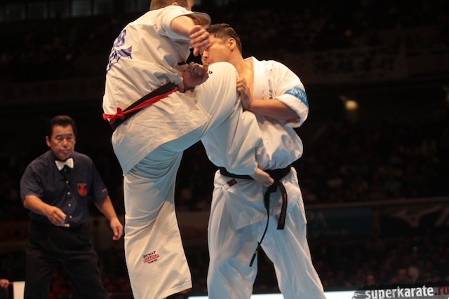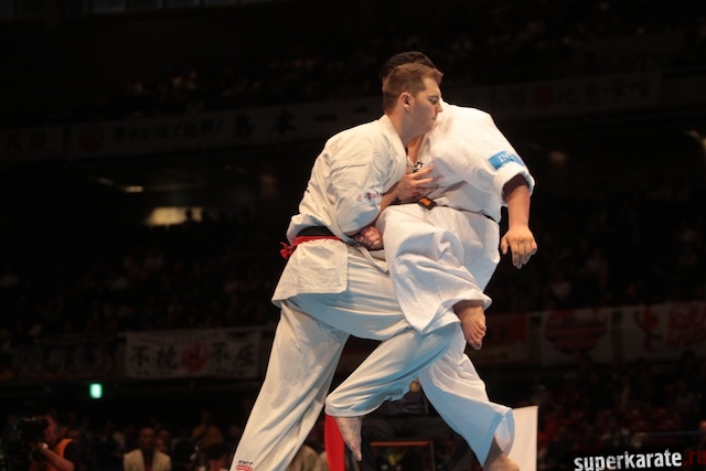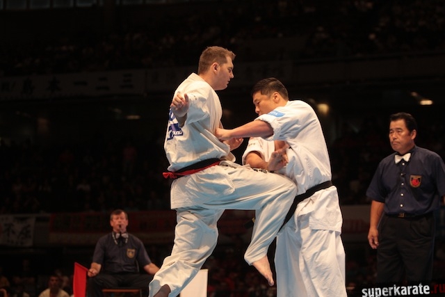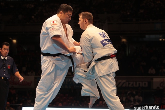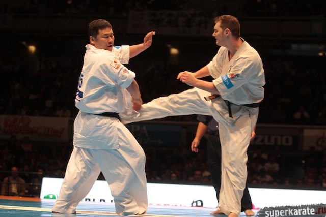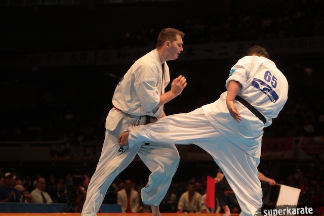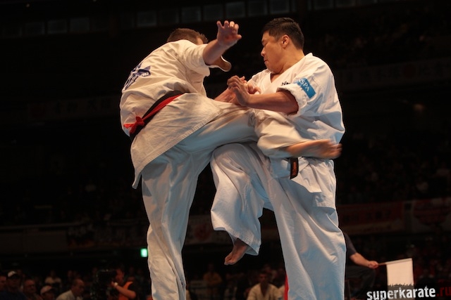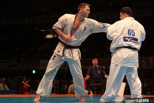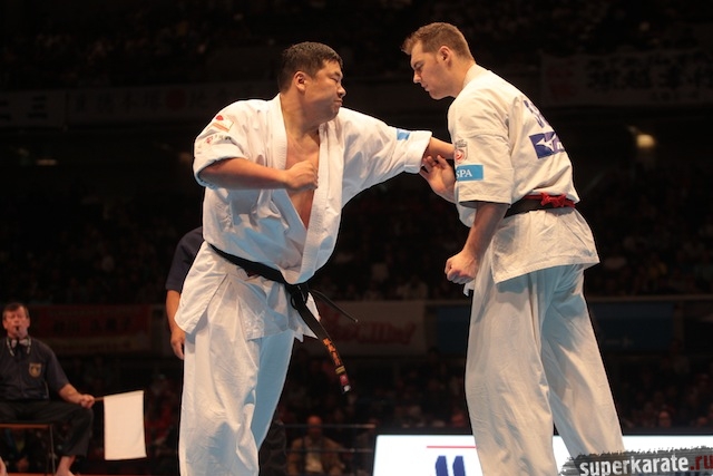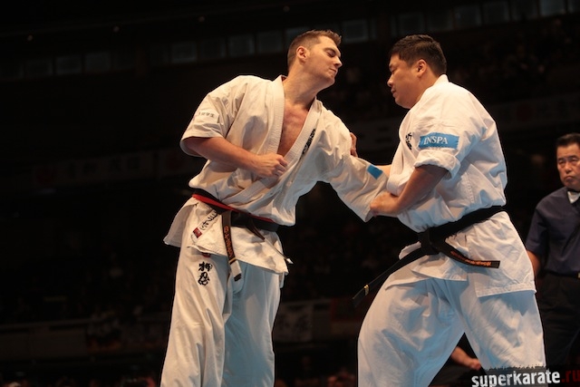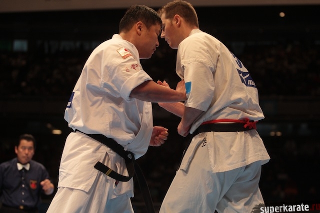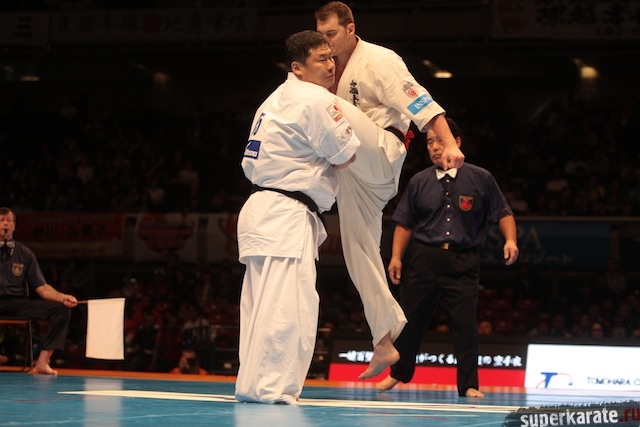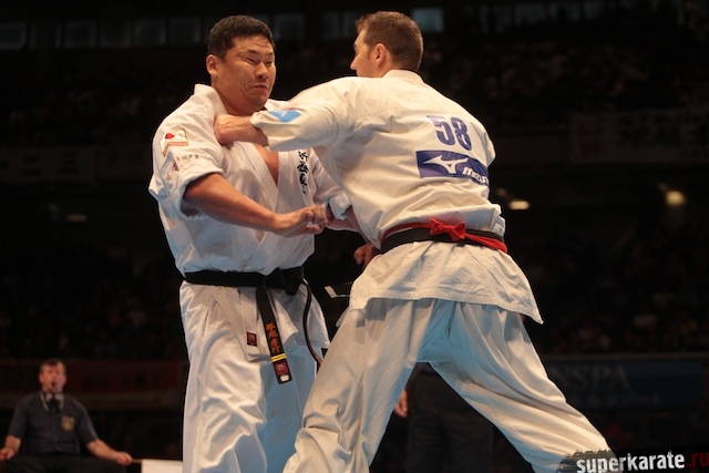 Поединок 1/16 финала чемпионата Мира по шинкиокушинкай, в котором знаменитый Такаюки Цукагоши (Япония) проиграл после второго добавленного времени Брайану Якобсену (Дания).