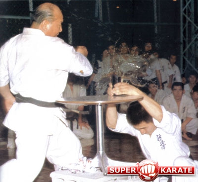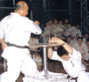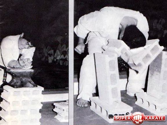 Коичи Кавабата, 3 дан разбил 15 плиток черепицы головой и сломал камень. Это вызвало у зрителей крики удивления.