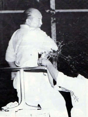Потом он со 2-й попытки срезал горлышко бутылки, к восхищению не только сотрудников посольства, но и учеников Хонбу. Пораженная публика была полностью поглощена выступлением, сидя с широко открытыми глазами.