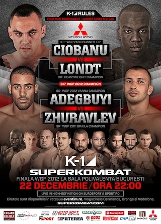 Компания K-1 Global представляет турнир SuperKombat WGP Final 2012, который состоится 22 декабря в Бухаресте. Главной составляющей мероприятия станет четверка в тяжелом весе. Также в программе несколько супербоев и поединок за титул чемпиона мира по версии SuperKombat в весовой категории до 95 кг. В финале SuperKombat WGP выступят Исмаел Лондт, Павел Журавлев, Бенджами Адегбуи и Себастьян Чиобану. Причем полуфинальные пары распределились таким образом, что встречаются «природный» и «не природный» тяжеловесы. Так c трудом дотягивающему до 100 кг Павлу Журавлеву будет противостоять 120-ти килограммовый Адегбуи, а не слишком большой Чиобану встретится с Лондтом, вес которого порядка 115 кг.