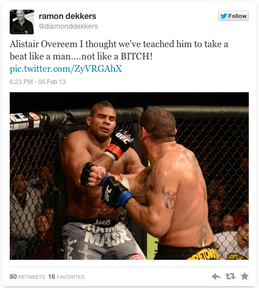 Легендарный голландский кикбоксер Рамон Деккерс не выдержал и в своем аккаунте на Twitter лаконично отозвался о том, что думает по поводу поражения Алистара Оверима, нанесенного ему Антонио Силвой. Деккерсу, который тренировался в одном зале с Оверимом и, в том числе, учил Алистара многим приемам из кикбоксинга, обидно за то, что продемонстрировал в октагоне его соотечественник.