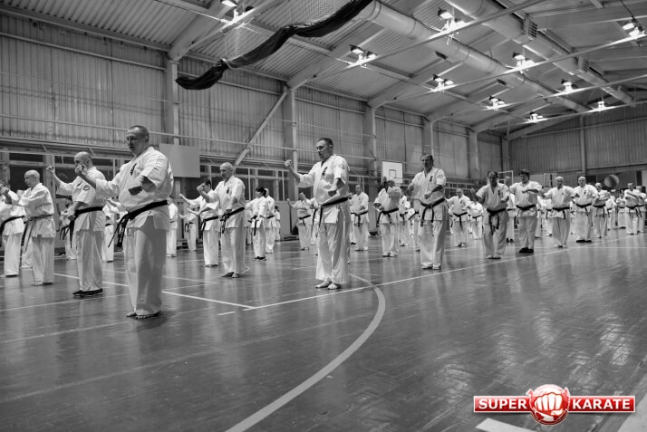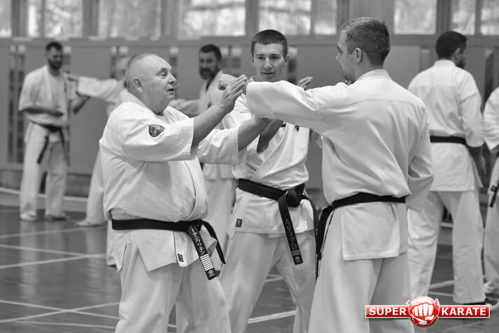 На практической части судейского семинара по ката участники были разбиты на две группы. Сэнсэи и Шиханы разбирали нюансы высших ката с Виктором Фоминым, вторая группа параллельно оттачивала программу коричневых и черных поясов под руководством членов судейской коллегии ФКР шиханов Александра Бревнова и Сергея Чубарова.