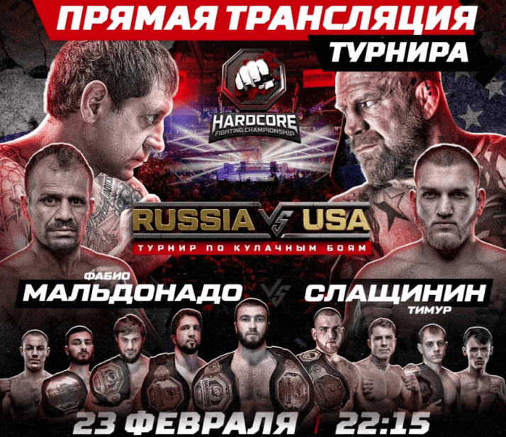 23 февраля в рамках турнира Hardcore Fighting Championship состоится реванш Александр Емельяненко и Джеффа Монсона. Поединок пройдет по правилам кулачного боя и возглавит матчевую встречу "Россия - США". В соглавном противостоянии вечера сразятся Фабио Мальдонадо и Тимур Слащинин.