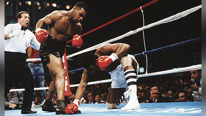 Майк Тайсон – Майкл Спинкс, Атлантик-Сити (США). 27 июня 1988 года. В конце 80-х у Майка Тайсона была в лучшая форма. "Железный" Майк к тому времени завоевал титулы почти по всем основным версиям. Оставался только пояс по версии журнала The Ring. И тогда он стал бы обладателем полного комплекта. Владел желанной наградой непобежденный Майкл Спинкс. Майк превзошел себя, поскольку в том поединке он мгновенно после гонга кинулся атаковать соперника. Уже на первой минуте нанес свою фирменную комбинацию «левый апперкот, левый хук по туловищу» и тем самым вынудил конкурента опуститься на одно колено. Так Спинкс пополнил личный рекорд первым нокдауном в своей боксерской карьере. После этого последовало еще два хука в голову от Тайсона. Его конкурент не смог встать на ноги. Примерно через месяц после произошедшего Спинкс объявил о завершении профессиональной карьеры.