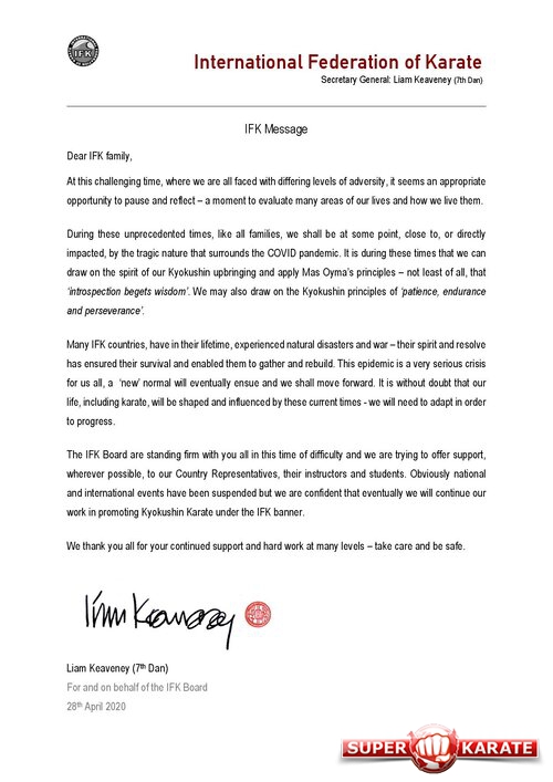 Правление IFK твердо стоит вместе со всеми вами в это трудное время, и мы стараемся предложить поддержку, где это возможно, нашим представителям стран, их преподавателям и студентам. Очевидно, что национальные и международные мероприятия были приостановлены, но мы уверены, что в конечном итоге продолжим нашу работу по продвижению киокушин карате под флагом IFK.