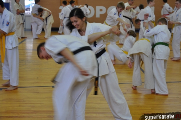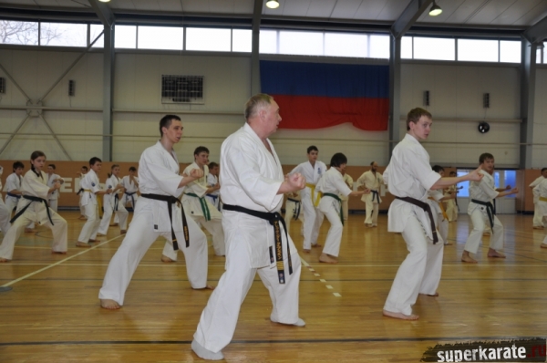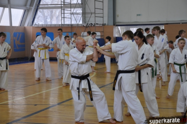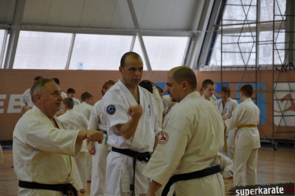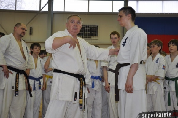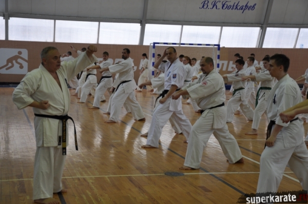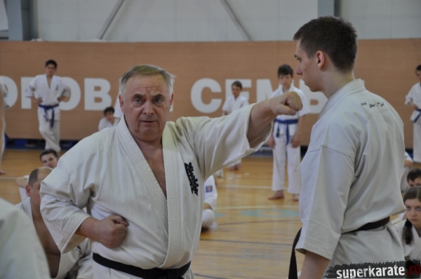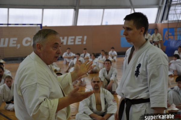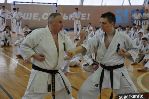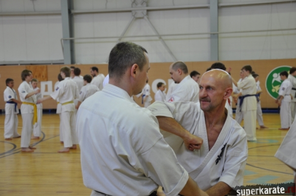 Все зависит от обстоятельств. Как правило, я варьирую программу в зависимости от уровня подготовки местных каратистов. Если в зале собираются в большинстве своем коричневые пояса - я больше внимания уделяю технике, проверяю ката, обращаю внимание на нюансы выполнения кихона, не вдаваясь в прикладные аспекты. Бывает, что приезжаю в город, где на тренировку приходят одни черные пояса, тогда уровень сложности конечно возрастает.