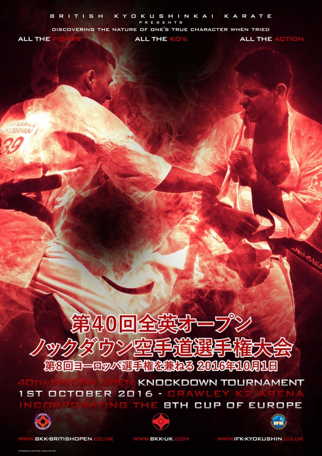 1 октября 2016 года в городе Кроули (Лондон, Великобритания) пройдет 8-й Кубок Европы (BKK 40th British Open Knockdown Tournament 2016). В турнире среди мужчин и женщин примут участие бойцы из 10 организаций (WKO, IFK, KAN(IK), WKB, IKO Matsushima, Rengokai, So-Kyokushin, IBK Gordeau, Shootfighters) и 22 стран: Казахстан (5), Бельгия (9), Коста Рика (3), Турция (4), Россия (15), Нидерланды (7), Франция (6), Болгария (8), Испания (16), Швеция (1), США (2), Боливия (1), Германия (2), Ирландия (5), Греция (2), Литва (8), Венгрия (5), Норвегия (2), Румыния (19), Канада (1), Израиль (1), Великобритания (19).Состав участников на загляденье - элита европейского и мирового киокушина из разных организаций, лидеры своих стран. Бескомпромиссность грядущих поединков обусловлена битвой не только за зал и страну, но и за свою организацию.