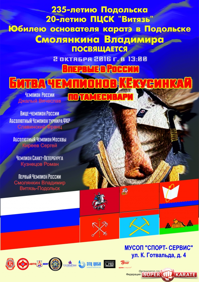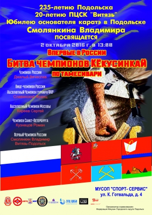 2 октября 2016 года в Подольске состоится турнир «Битва Чемпионов Кёкусинкай» по тамэсивари, посвященный 235-летию Подольска, 20-летию Центрального спортивного клуба «Витязь» и юбилею основателя каратэ в Подольске Смолянкина Владимира.В турнире принимают участие: Чемпион России Джалый Вячеслав, Вице-чемпион России, абсолютный Чемпион турнира ФКР (IFK) Славинский Франц, абсолютный Чемпион Москвы Киреев Сергей, Чемпион Санкт-Петербурга Кузнецов Роман, первый Чемпион России Смолянкин Владимир.