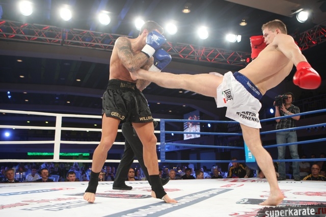 Если до этого на ринг выходили бойцы К-1 тяжелой и супертяжелой весовых категорий, то теперь настала очередь средневесов. Артур Кишенко (Украина) против Ники Хольцкена (Голландия). Ники Хольцкен уже давно не тот, что был раньше. А вот переход Кишенко в голландский клуб пошел ему на пользу. Артур стал спокойнее и тактически более грамотным. И если в первом раунде была хоть какая-то равная борьба, то во втором и третьем четко обозначилось солидное преимущество Кишенко. В итоге Артур победил единогласным решнием судей.