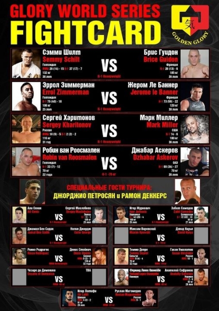 23 марта в Москве компания Golden Glory планирует провести грандиозный турнир по кикбоксингу и смешанным единоборствам с участием таких известных бойцов, как Сэмми Шилт, Эррол Циммерман, Сергей Харитонов, Робин ван Русмален и Джабар Аскеров. А в качестве специальных гостей турнира заявлены легендарный голландский ветеран кикбоксинга Рамон Деккерс и лучший средневес нашего времени Джорджио Петросян.