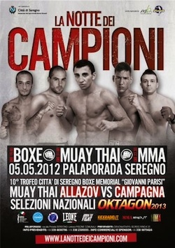 5 мая в Сереньо (Италия) состоялся турнир La Notte del Campioni, в главном бою которого встертились чемпион мира по кикбоксингу по версии WAKO-PRO в разделе К-1 Алессандро Кампанья (Италия) и одна из самых ярких молодых звезд европейского кикбоксинга и тайского бокса Чингиз Аллазов (Беларусь).