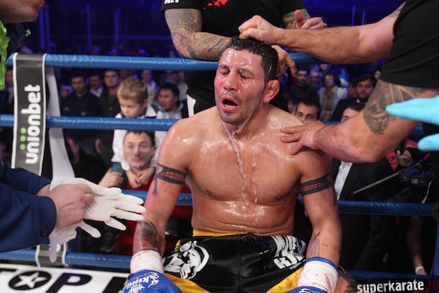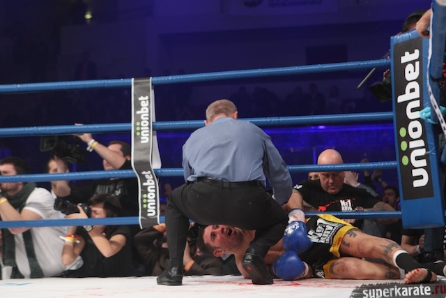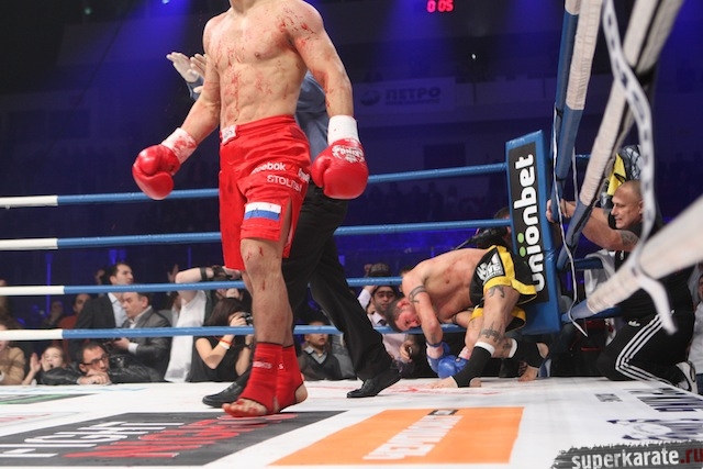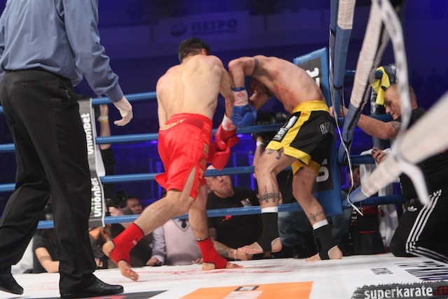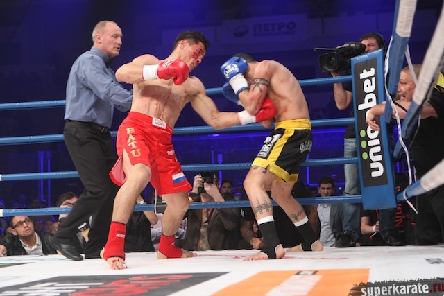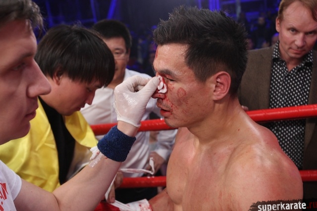 Хасиков держал подбородок опущенным, и это не позволило Драго сильно потрясти Бату. Но вот на переносице российского спортсмена образовалось сильное рассечение и обильно пошла кровь.