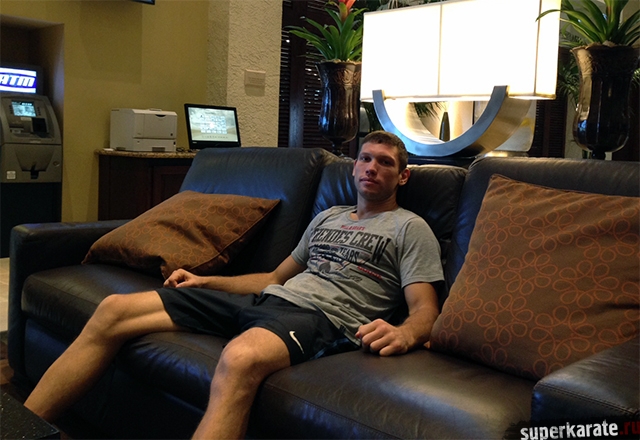 Сегодняшний день у Александра Стецуренко начался с разминки, но до боя осталось совсем немного времени, и в первый адаптационный день Александр больше отдыхал. Сходил на пляж, поплавал и позагорал.