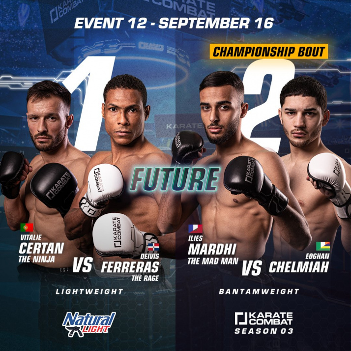 В центральном поединке турнира Karate Combat за титул в легчайшем весе сразились ирландец Эоган Хелмия и представитель Франции Илиес Мардхи. После 5 проведенных раундов преимущество поочередно переходило к каждому из бойцов, а победитель должен был определиться в заключительной трехминутке, но главный рефери турнира Марк Годдард был вынужден остановить поединок. Причиной тому стал перелом руки Мардхи. В итоге, победа и первый в истории Karate Combat титул чемпиона в легком весе присуждены бойцу из Ирландии Эогану Хелмия.