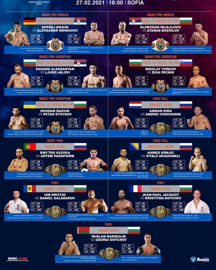 Вечером 27 февраля в Болгарии состоится турнир SENSHI 7. В рамках мероприятия состоятся 11 боев по правилам KWU SENSHI, KWU Full Contact и K-1. На ринг выйдут бойцы из 12 разных стран – Франции, Германии, Молдовы, Сербии, Беларуси, Португалии, Нидерландов, Словении, Боснии и Герцеговины, России и Болгарии. Пять поединков из 11 будут за титулы WAKO PRO в разделе К-1.