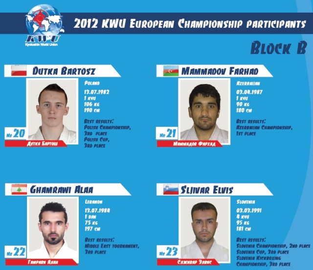 В группе "B" Чемпионата Европы выступят 18 бойцов. Средние показатели бойца этой категории: 27 лет, вес 88,8 кг, рост 182,5 см.Самый высокий боец группы Ghamrawi Alaa из Ливана - 197 см, при таком росте он весит всего 75 кг. Самый невысокий боец группы "В" Шахрияр Алиев из Азербайджана, рост которого всего 163 см. Разница в росте 34 см!