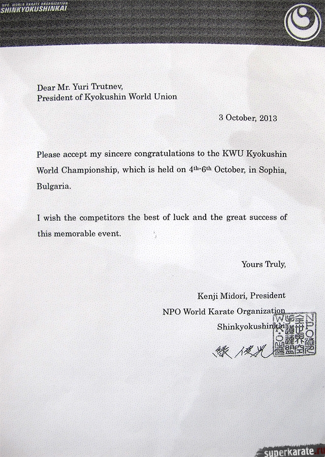 "Пожалуйста примите мои искренние поздравления с проведением турнира KWU Kyokushin World Championship, который пройдет 4-6 октября, в Софии, Болгария.